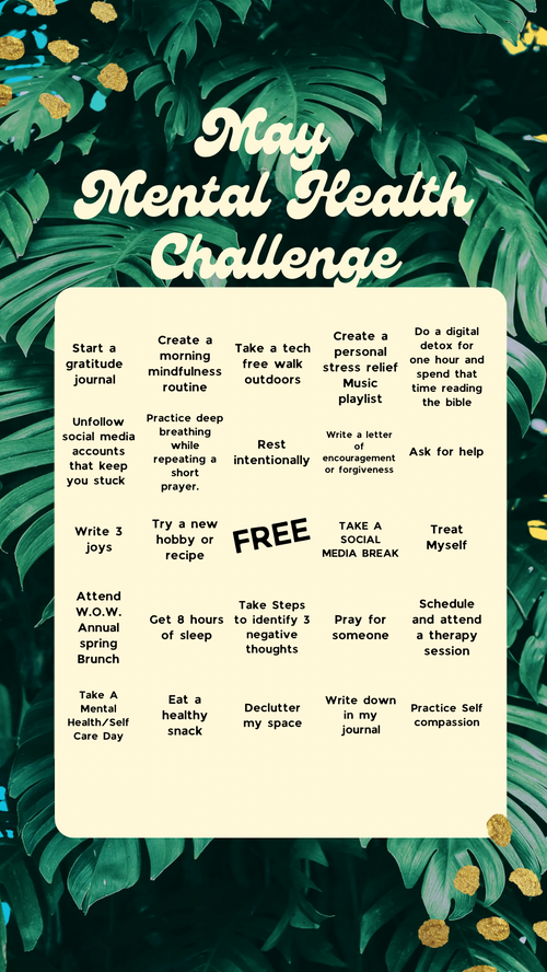 •Even if you do not complete all the boxes, we encourage you to prioritize your mental health beyond this challenge. Completing the bingo is just a start to ongoing self-care.